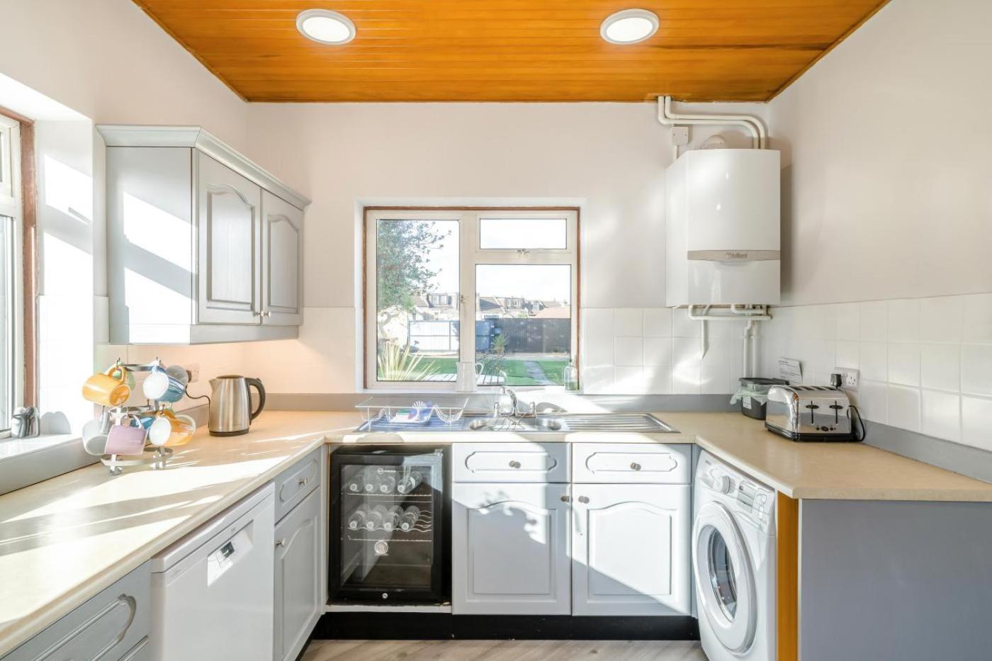 Four-Bedroom House. The fireplace is the standout feature of this holiday home. Boasting a private entrance, this holiday home features 4 bedrooms and 2 bathrooms with a hairdryer. The kitchen has a dishwasher, kitchenware and an oven. The holiday home features a washing machine, tumble dryer, heating, a TV, as well as garden views. The unit has 5 beds.