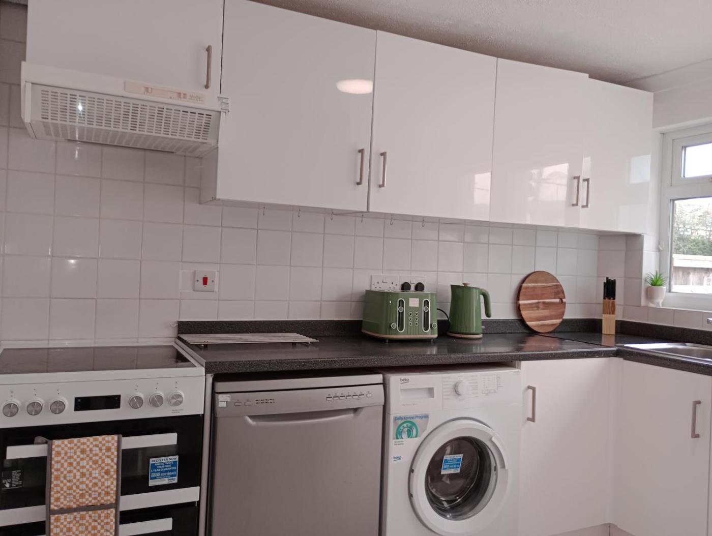 Three-Bedroom House. Boasting a private entrance, this holiday home comes with 1 living room, 3 separate bedrooms and 1 bathroom with a bath and a shower. Guests can make meals in the kitchen that features a stovetop, a refrigerator, a dishwasher and kitchenware. The holiday home has parquet floors, a seating area with a flat-screen TV, a washing machine, a dining area as well as garden views. The unit has 4 beds.