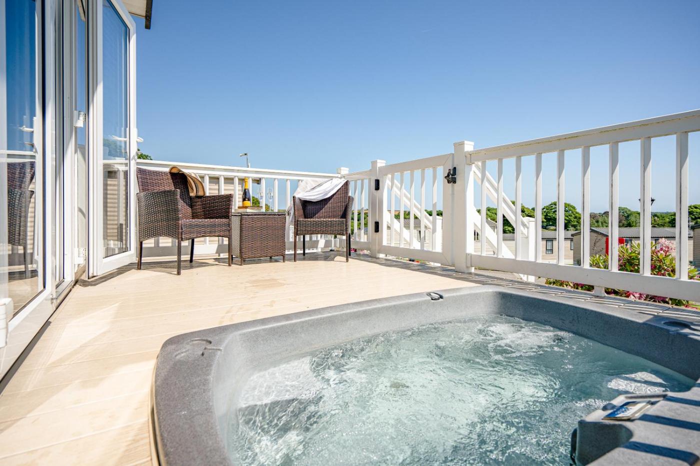 Holiday Home. This holiday home provides a hot tub. This holiday home comprises 1 living room, 1 separate bedroom and 1 bathroom with a shower and a hairdryer. Guests can make meals in the kitchen that comes with a stovetop, a refrigerator, kitchenware and an oven. This holiday home features a seating area, a dining area, a flat-screen TV and a terrace. The unit offers 1 bed. ;
