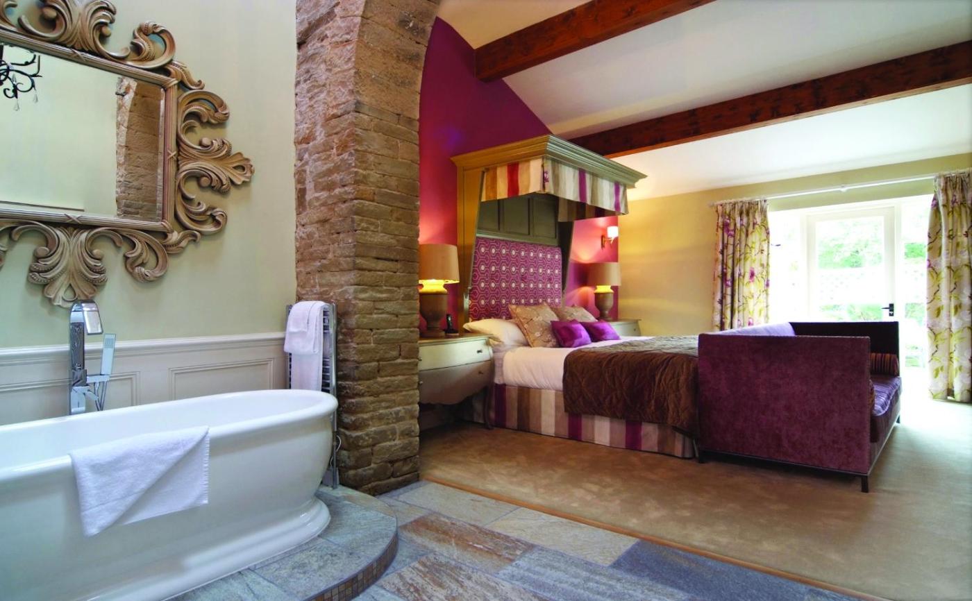 Suite. This spacious suite features a half-tester bed, a comfortable seating area, and an outside patio with a table and chairs. The en suite bathroom boasts a bath and a walk-in shower. ;