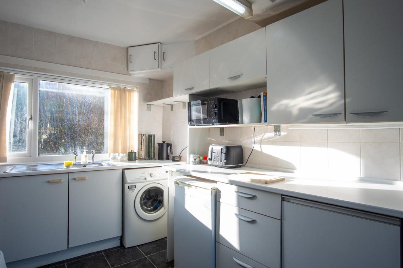 Three-Bedroom House. The holiday home has 3 bedrooms, 1 bathroom and a kitchen. The holiday homes kitchen is available for cooking and storing food. This holiday home features a washing machine, heating and a flat-screen TV. The unit has 3 beds.