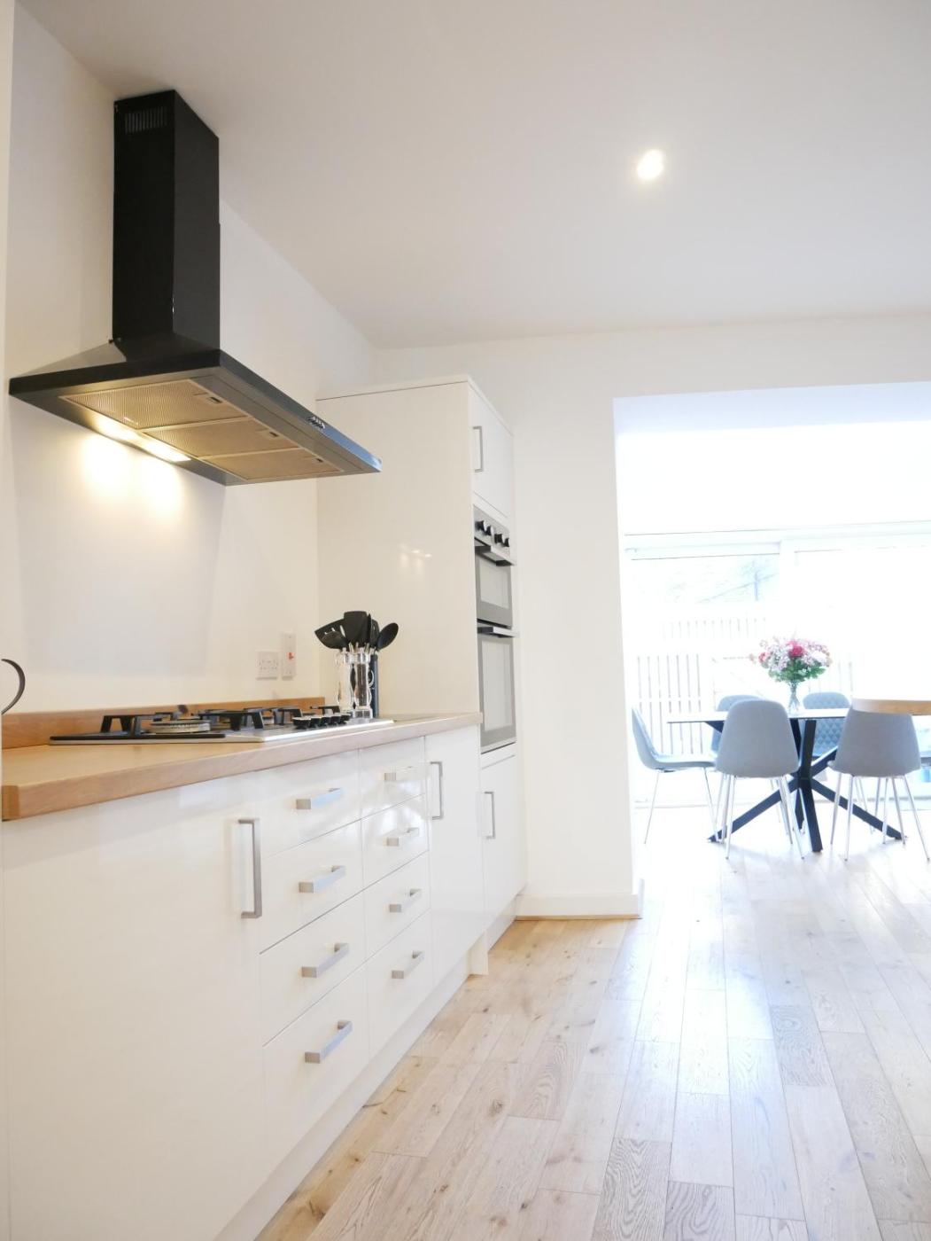 Four-Bedroom House. The well-equipped kitchen has a refrigerator, a dishwasher, an oven and a microwave. The holiday home features a washing machine, a coffee machine, a seating area, a flat-screen TV, as well as a quiet street view. The unit has 4 beds.